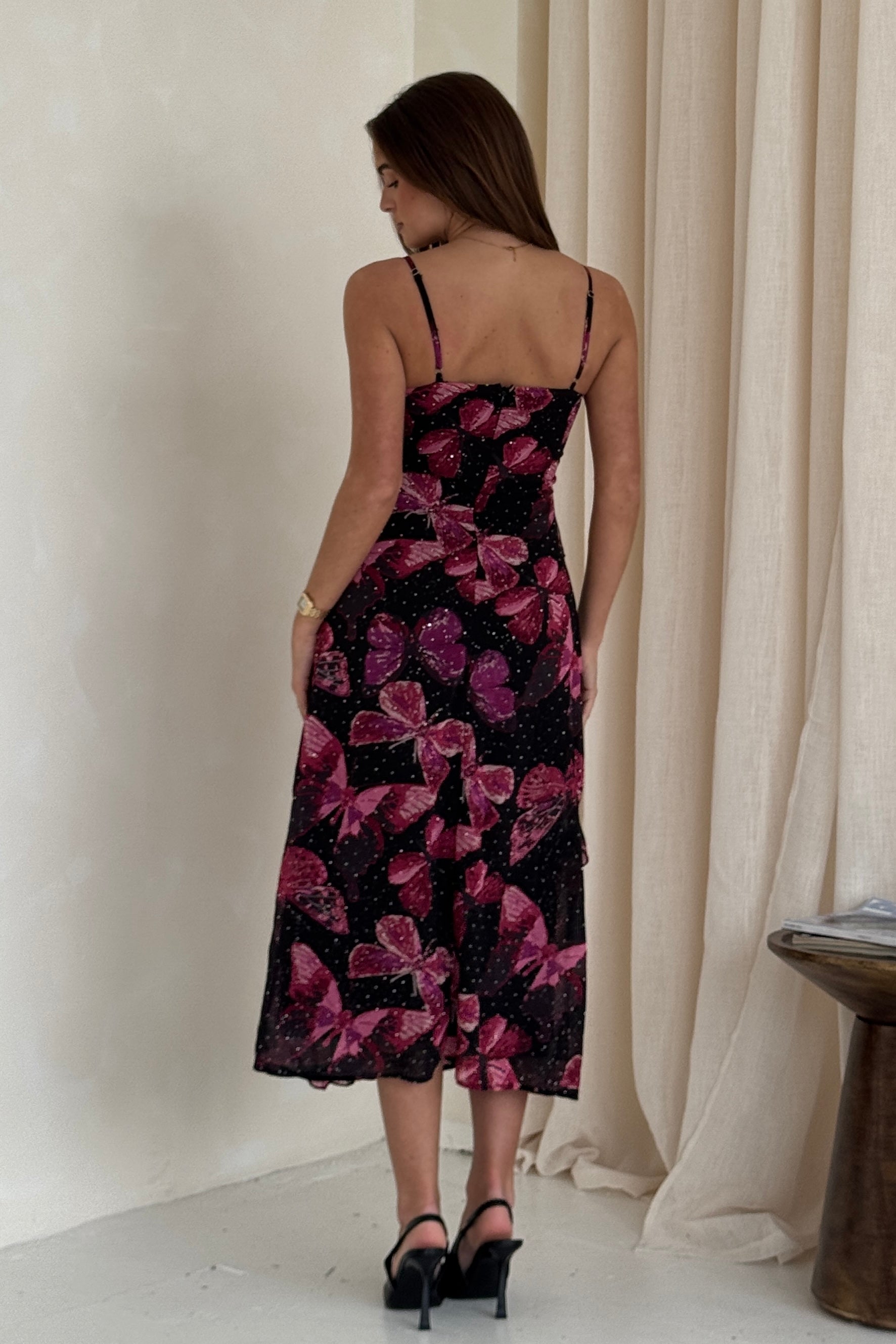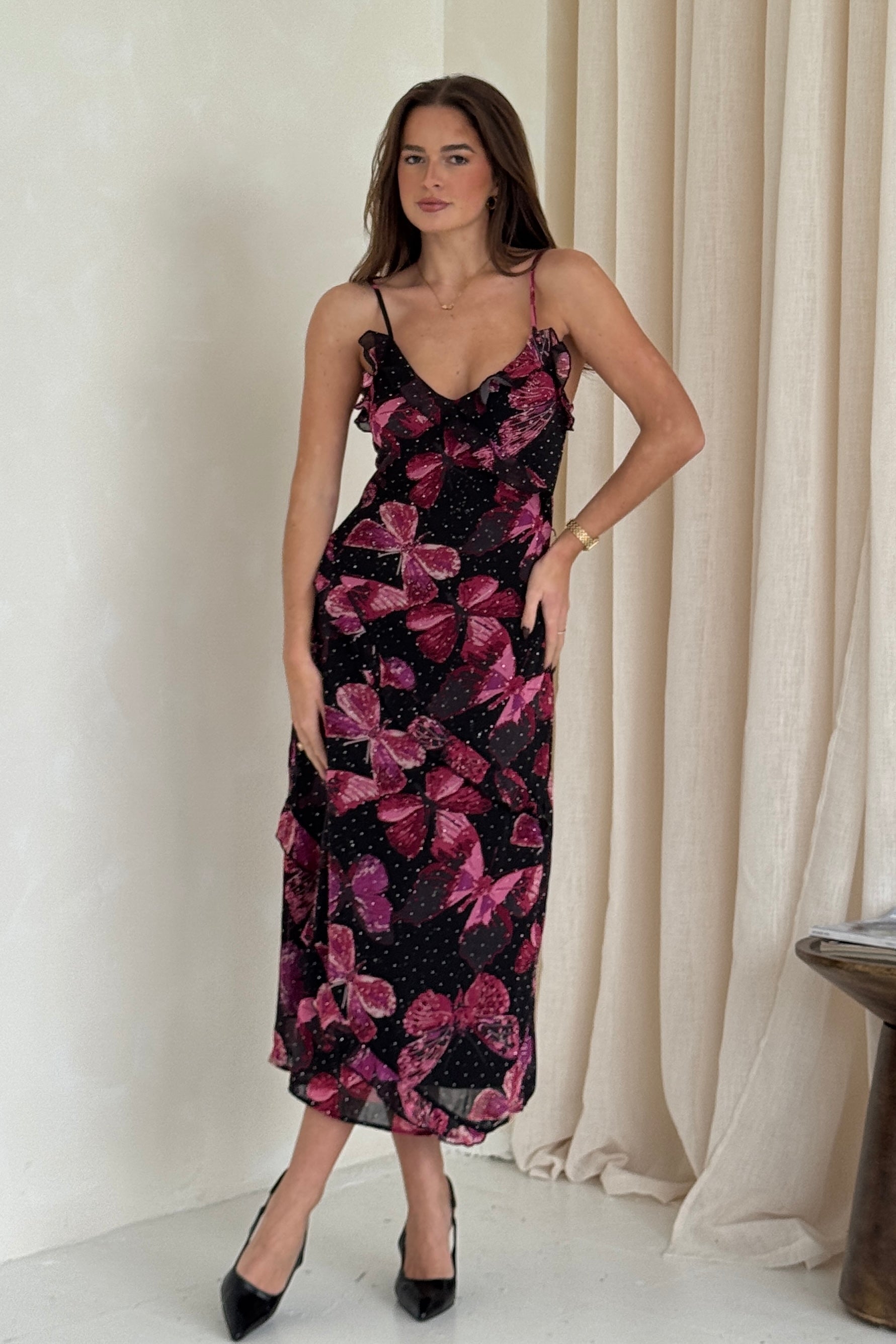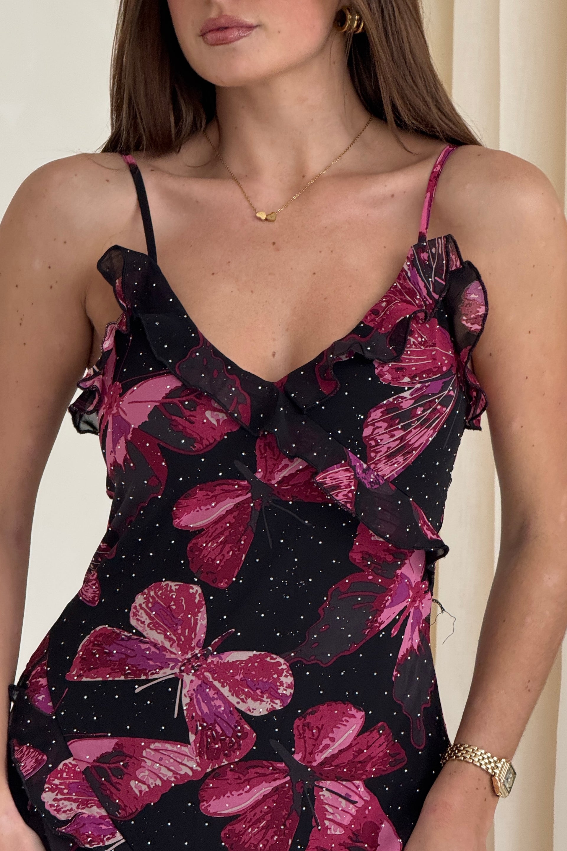 This enchanting Ainsley midi dress combines elegance and charm, featuring a delicate butterfly motif against a black starry diamante background. The ruffled neckline and adjustable spaghetti straps enhance its feminine appeal, making it perfect for any occasion. Flowy and lightweight, it offers comfort and sophistication in one effortless piece. Make a graceful statement wherever you go with this stunning dress!