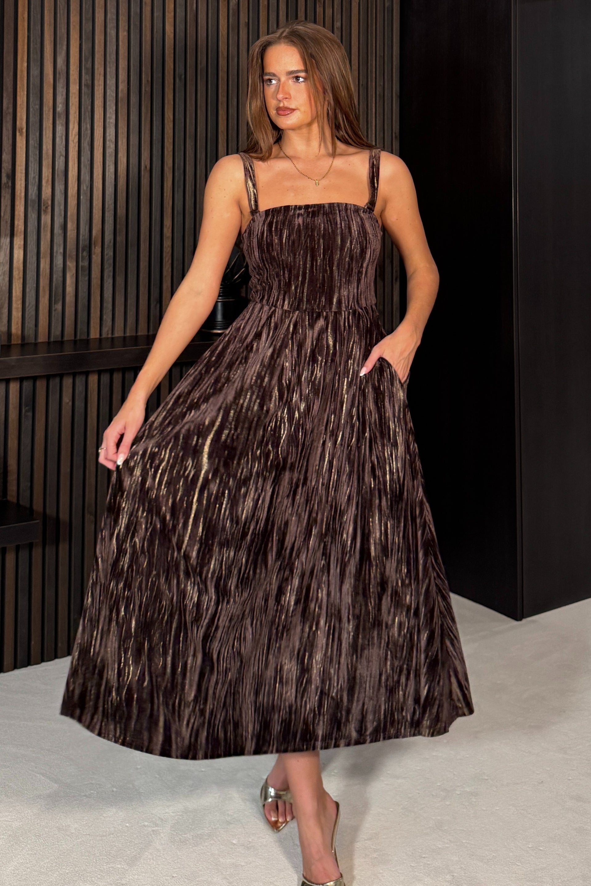 Danika Bandeao Brown Foiled Velvet Midi Dress