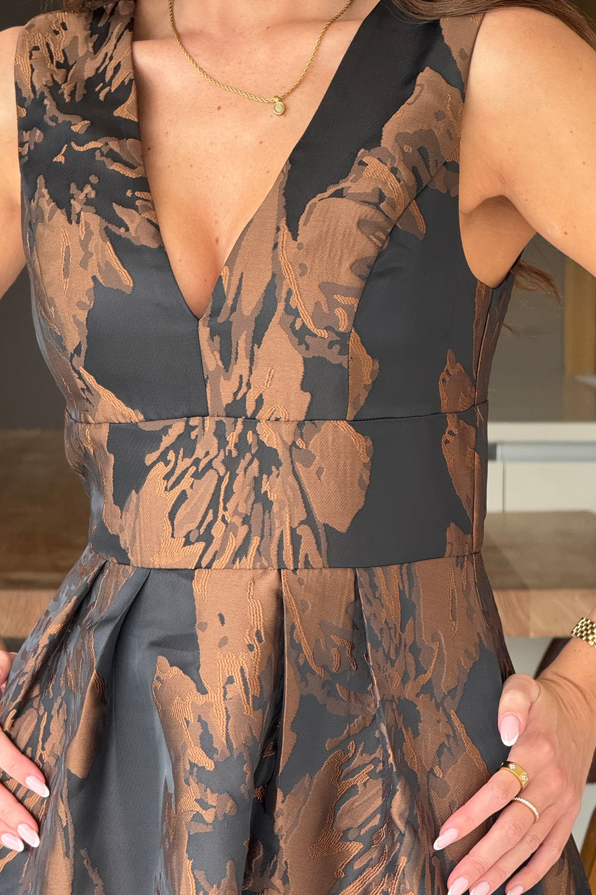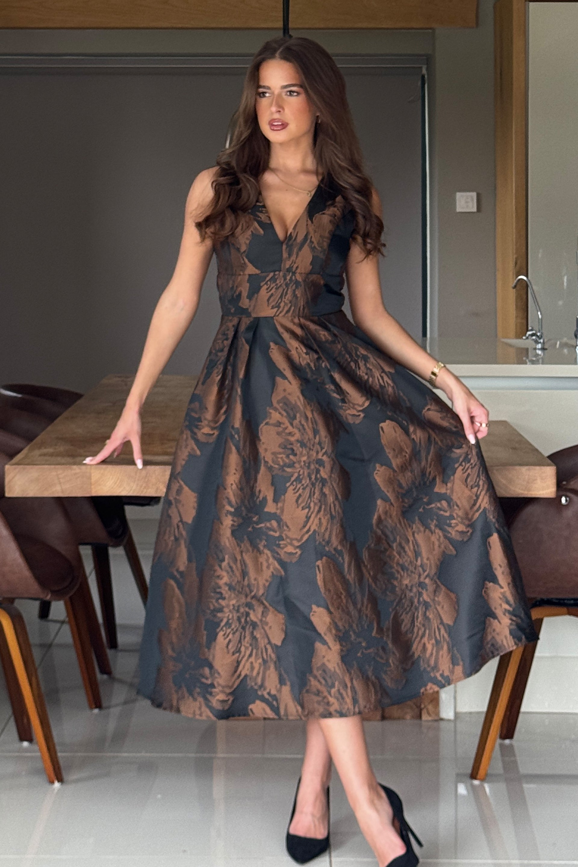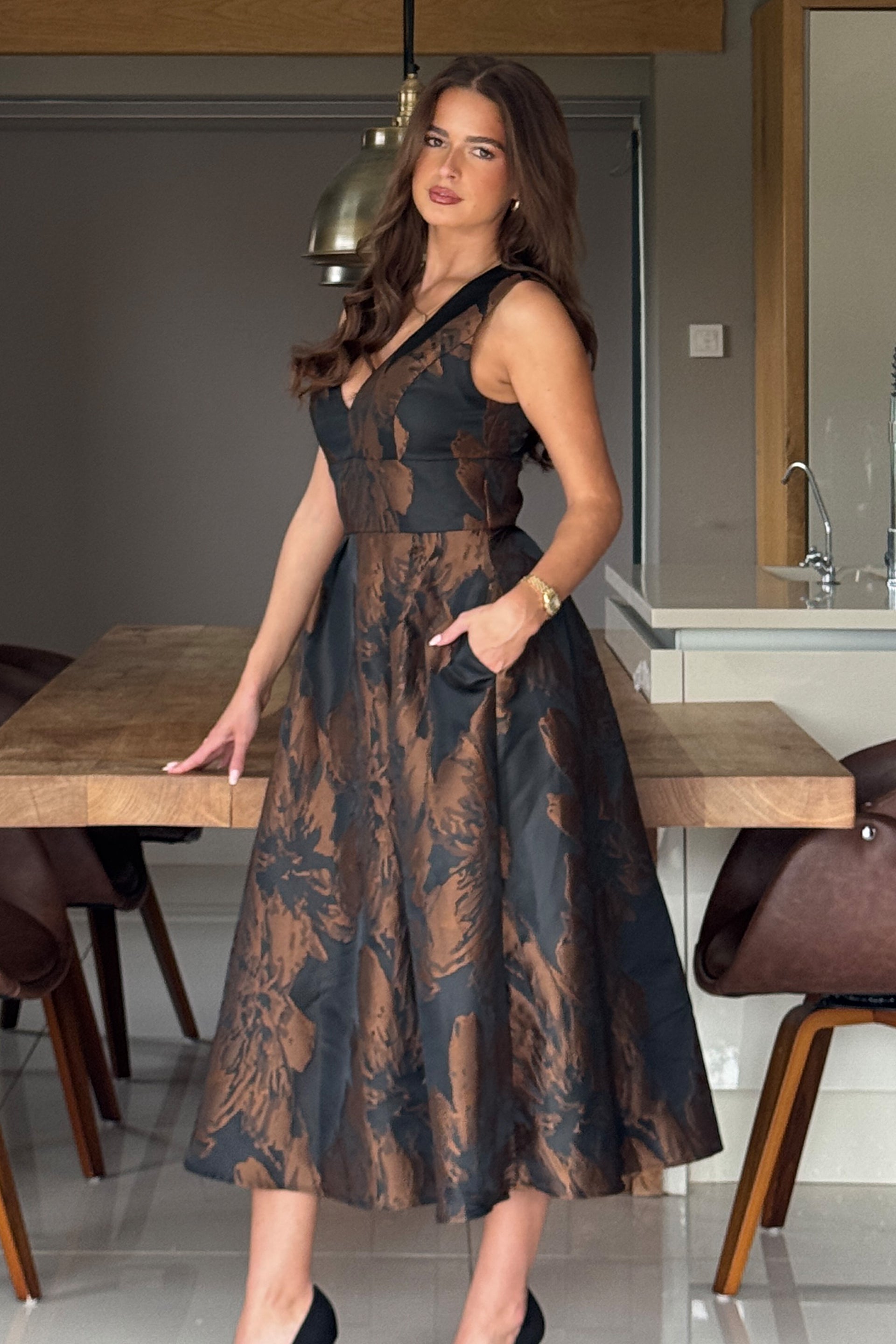 Jesinia Brown Jacquard V Neck Midi Dress – Girl In Mind