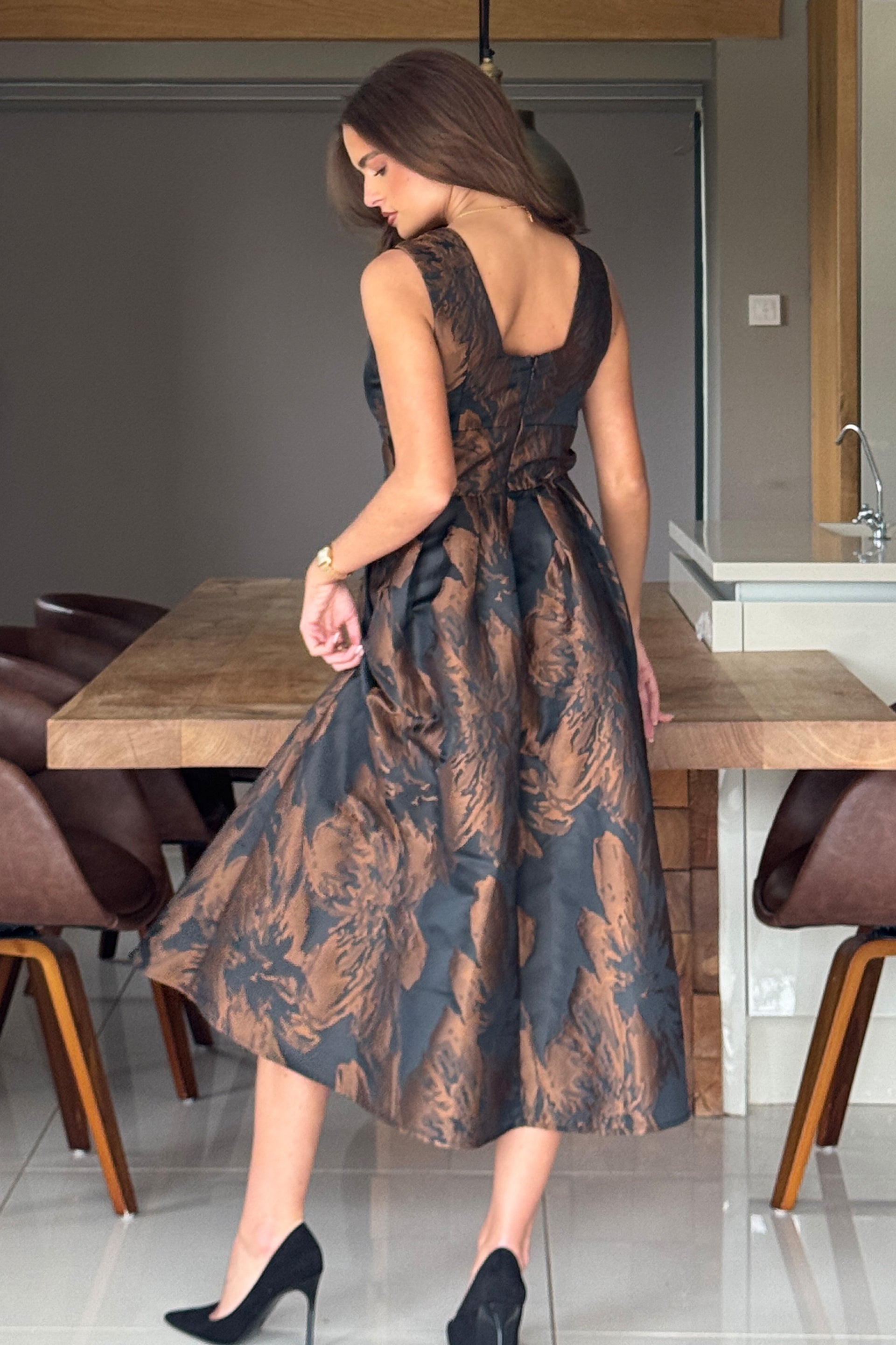 Jesinia Brown Jacquard V Neck Midi Dress