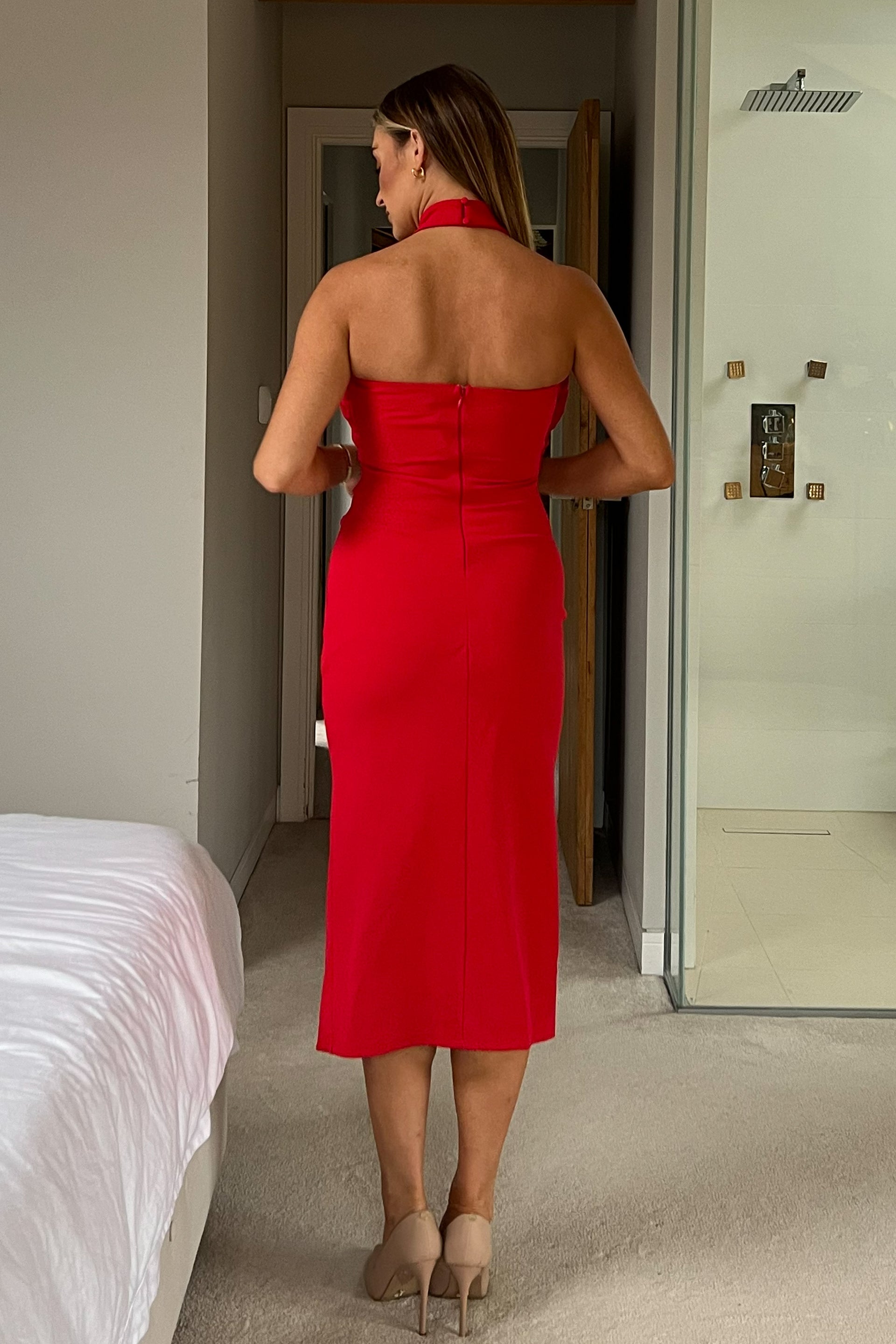 Bessie Halter Neck Side Split Midi Dress Bright Red