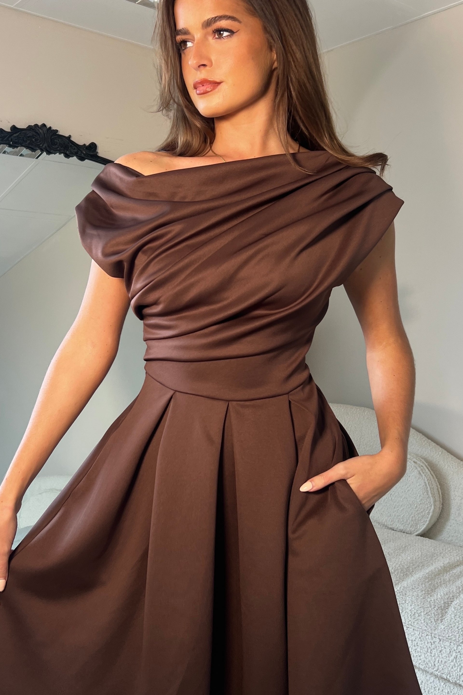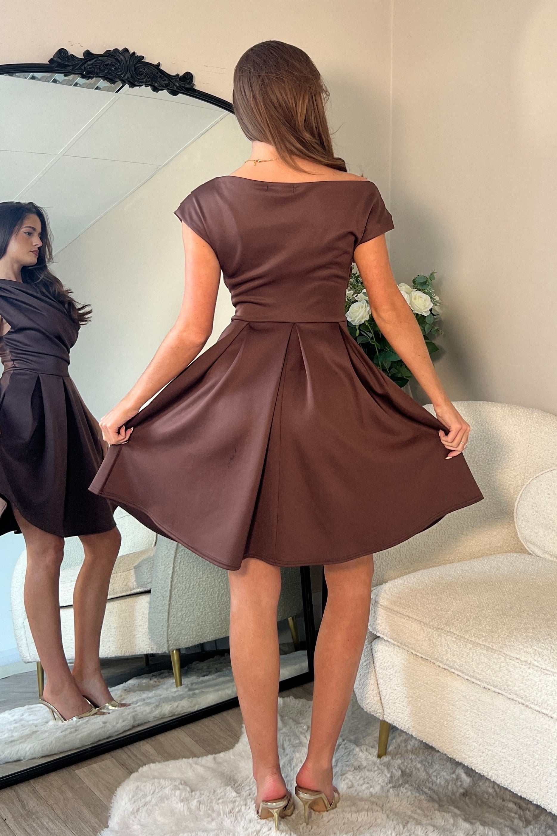 Betty Asymmetric Neckline Skater Mini Dress Brown