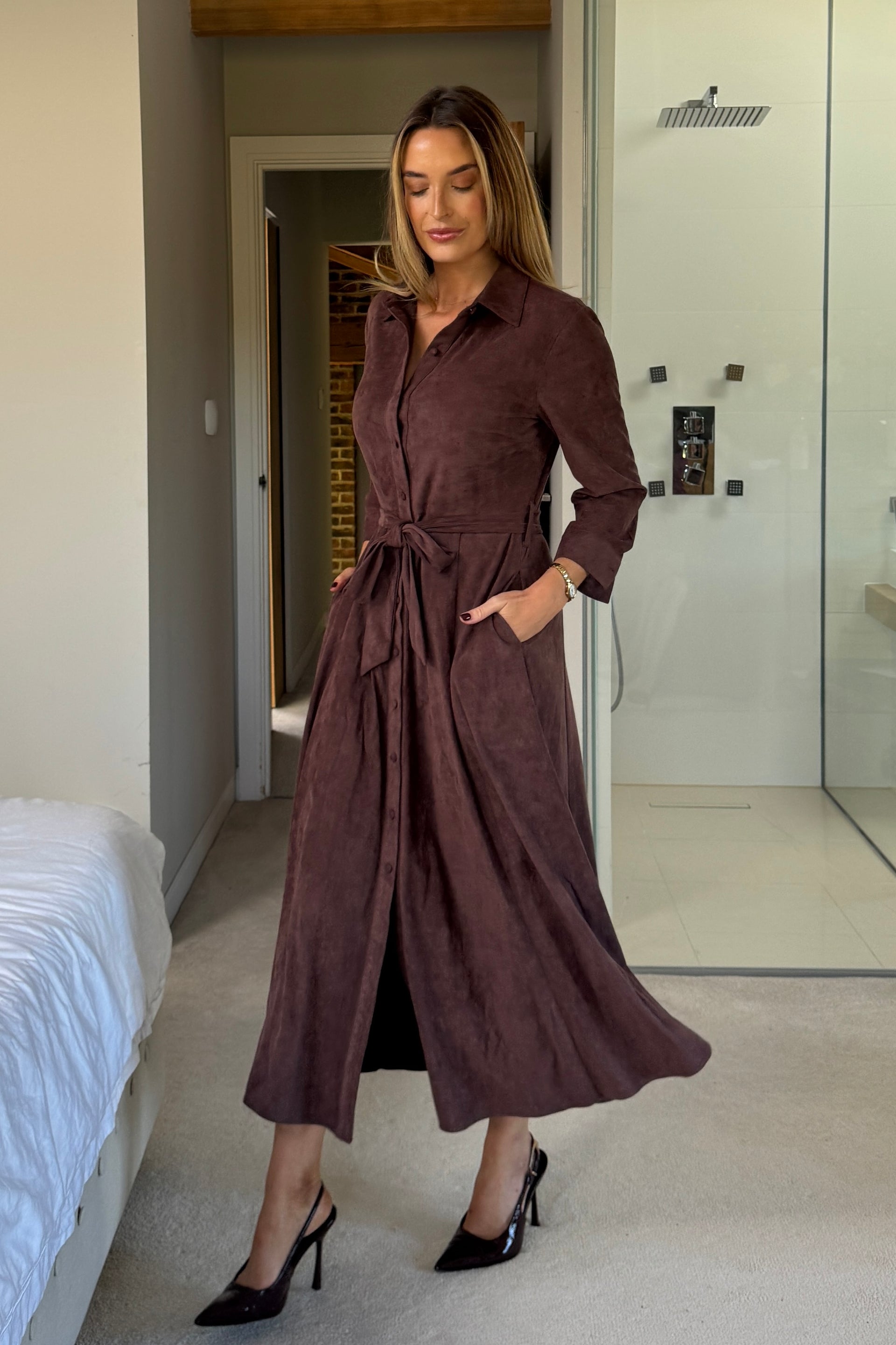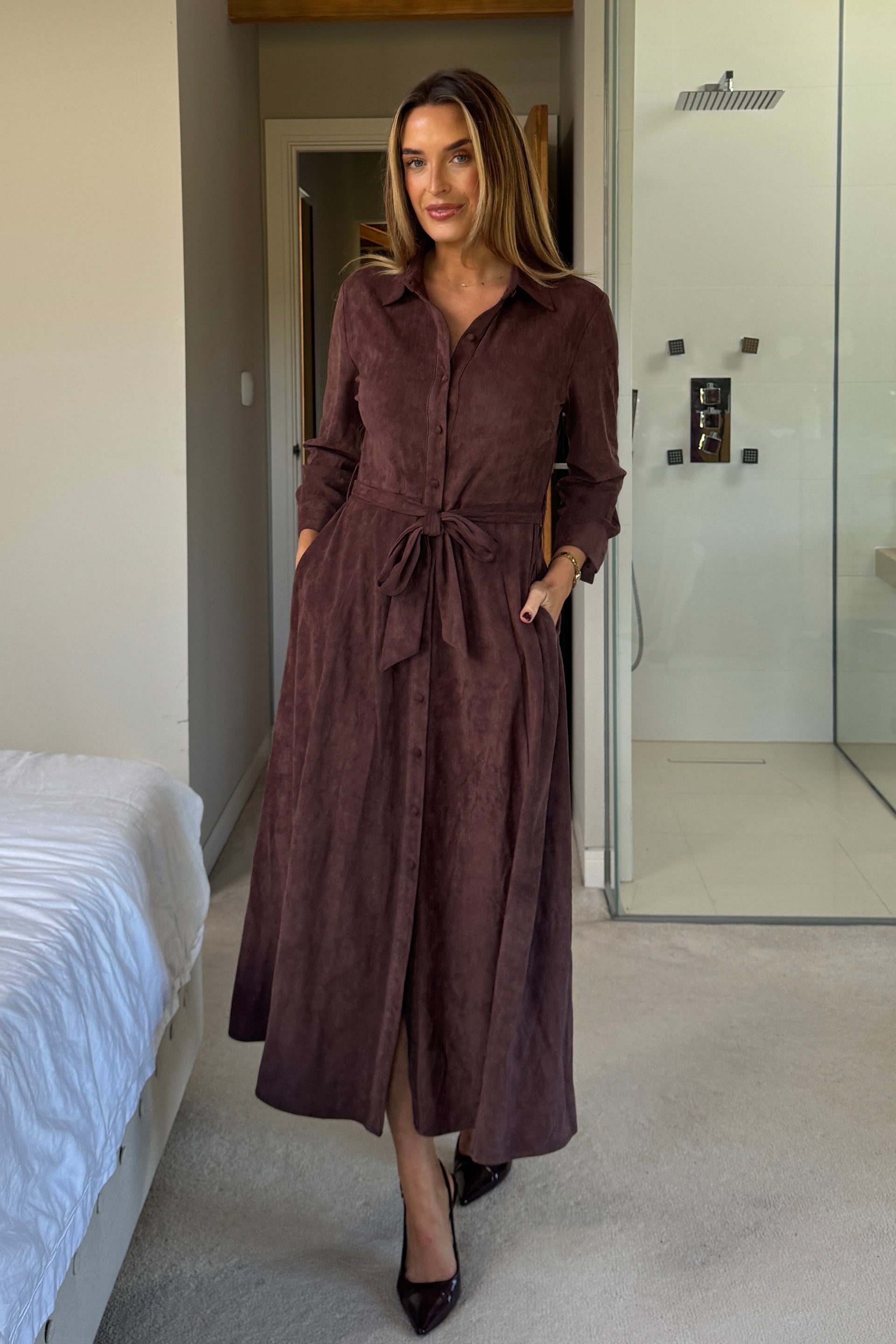 Angela Long Sleeve Maxi Shirt Dress Chocolate Suede