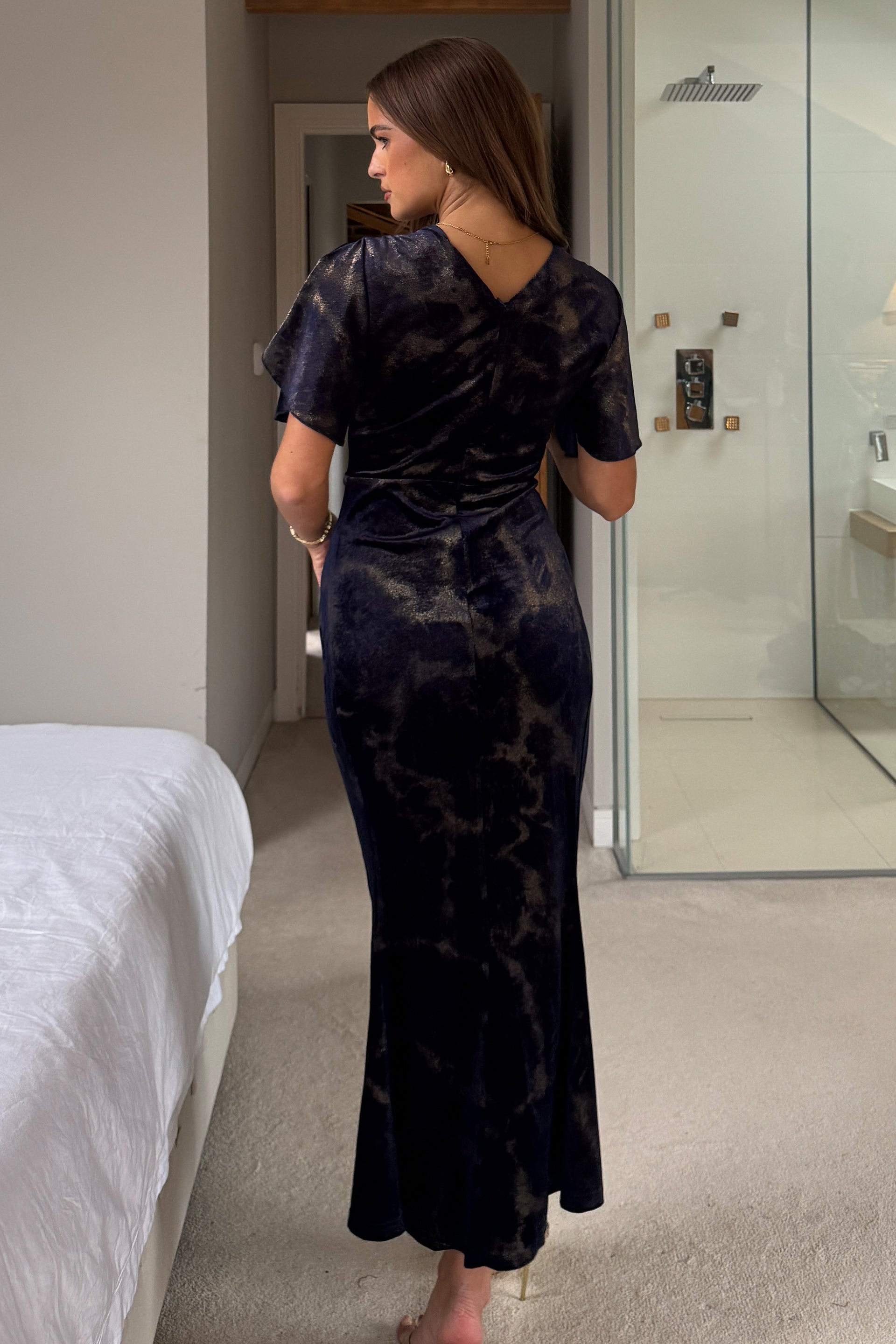 Cleo Navy And Gold Ruched Detail Midi Dress In Velvet