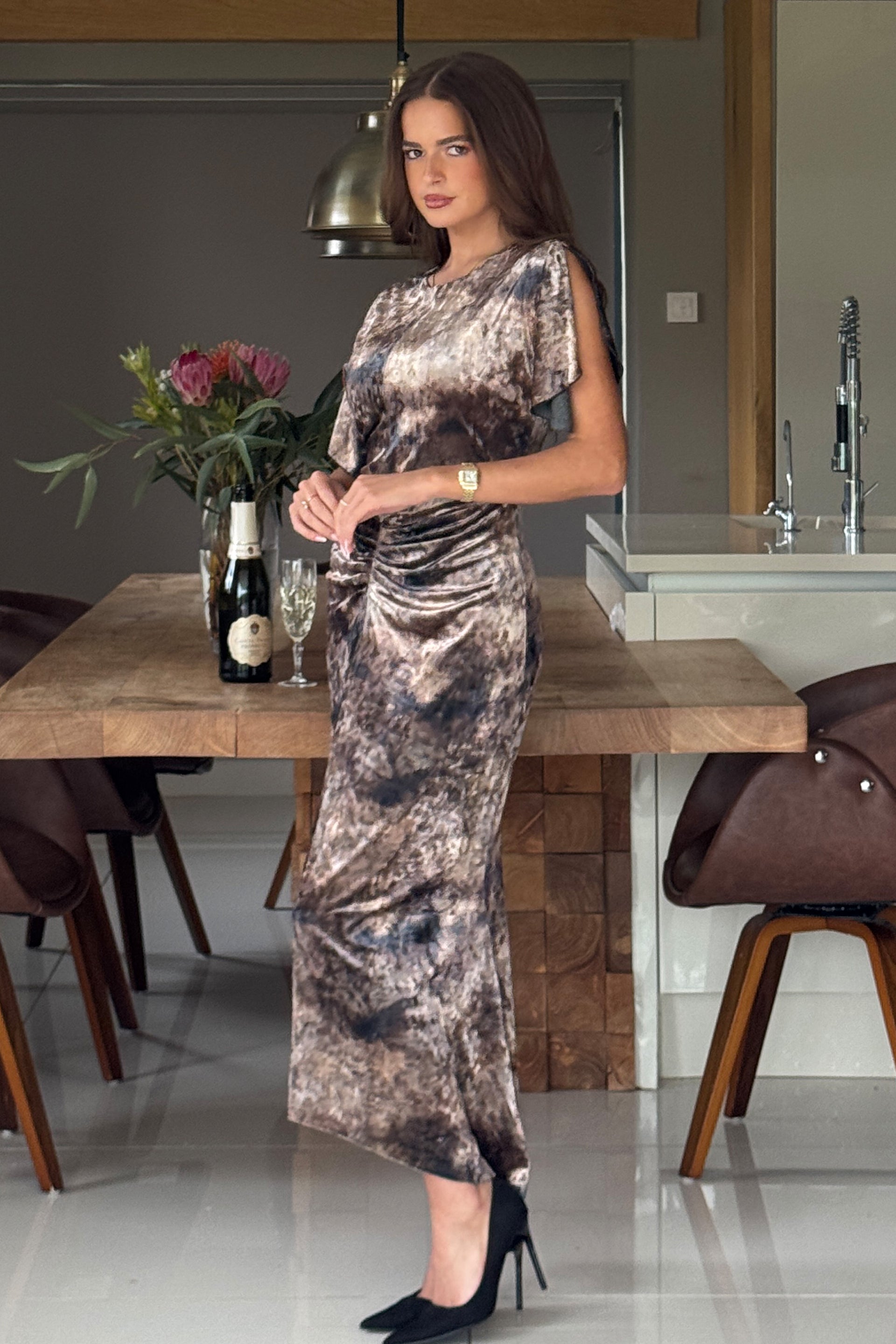 Cleo Ruched Detail Midi Dress In Abstract Gold Print Velvet