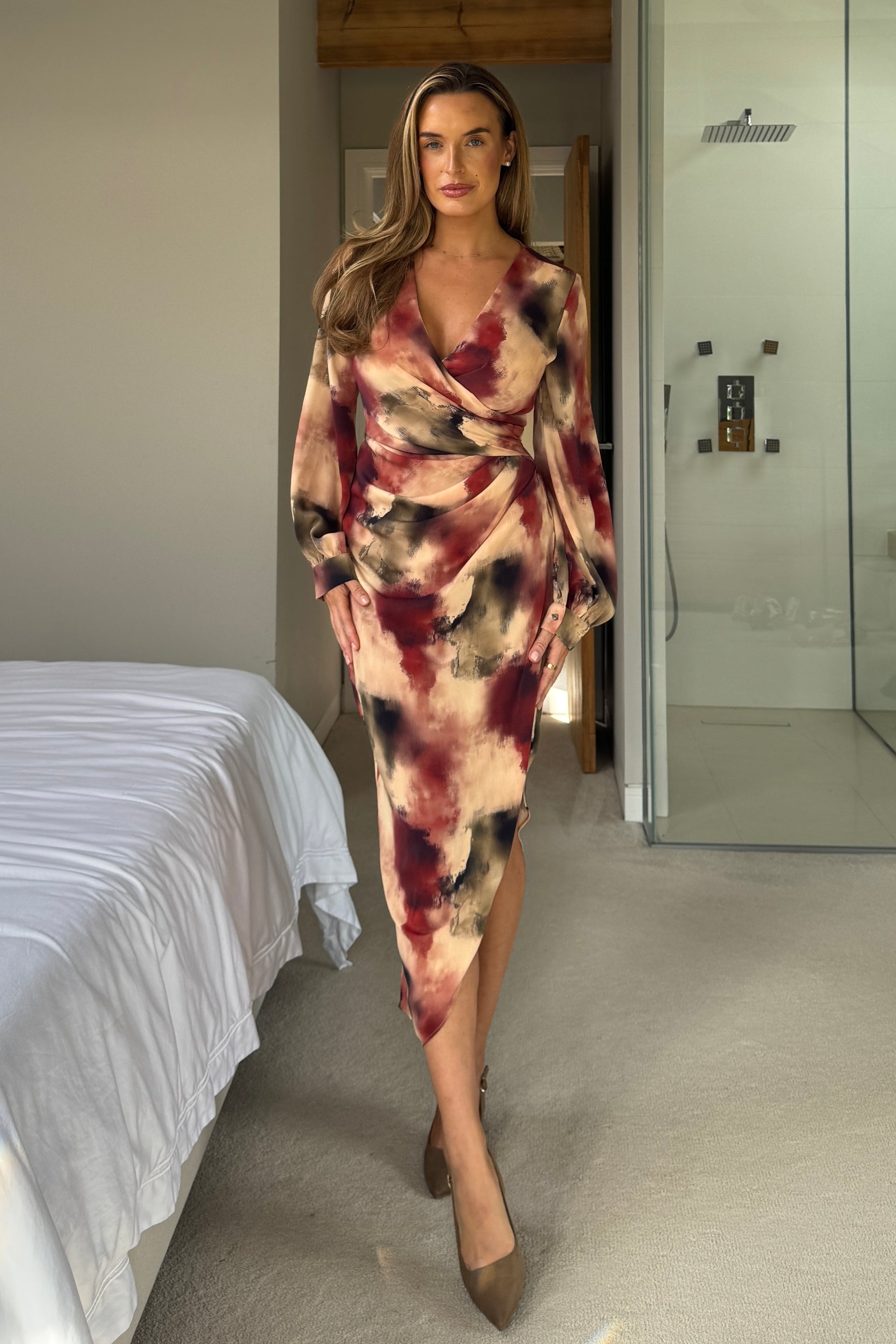 Add some glam to this seasons wardrobe, this gorgeous Elsa Long Sleeve Wrap Dress features a balloon sleeve with a wrap over waist and skirt with a ruched detail to cinch the waist in. The perfect evening out dress, style with some gold accessories and heels for this look.