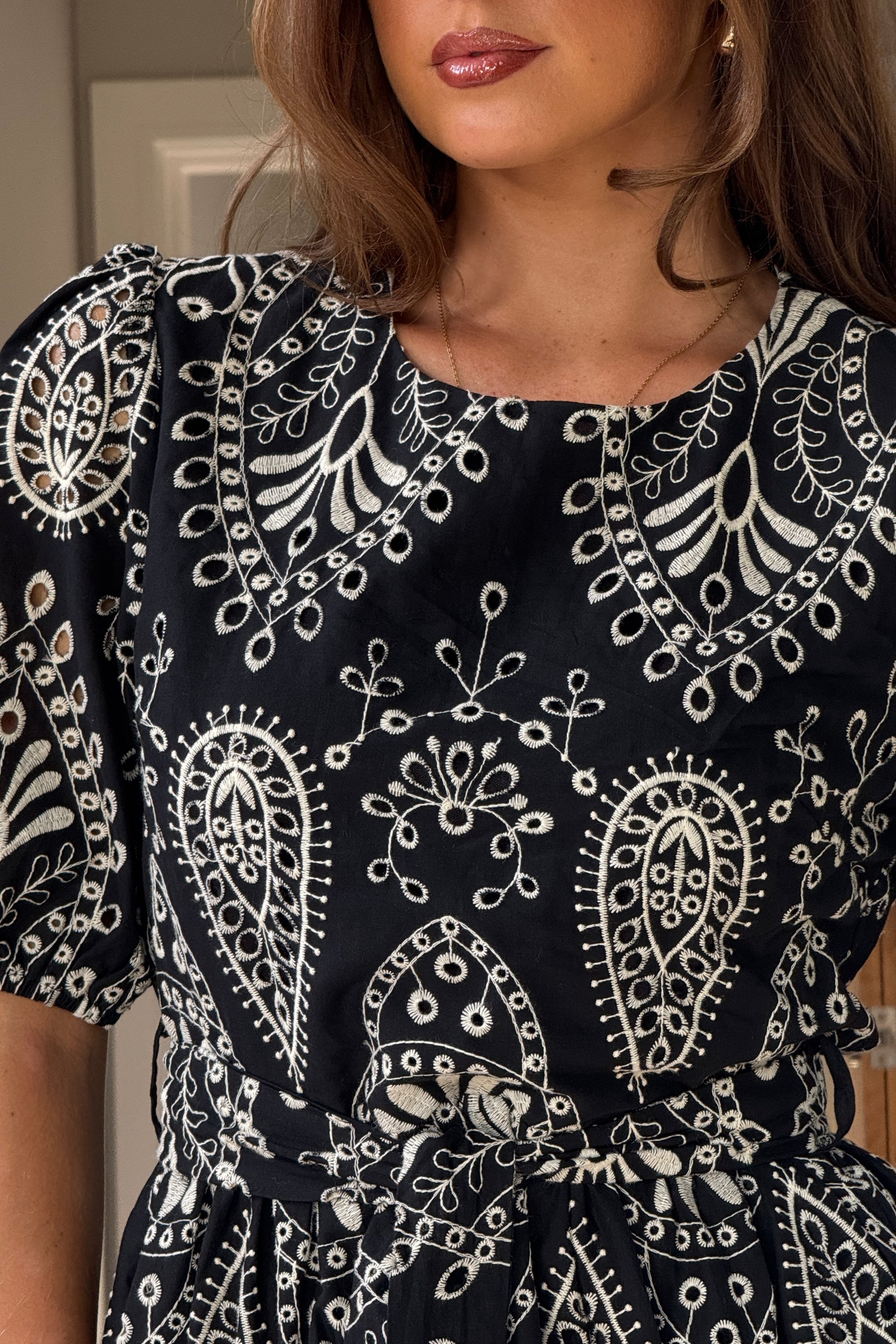 Fia Embroidered Puff Sleeve Tie Waist Mini Dress In Black