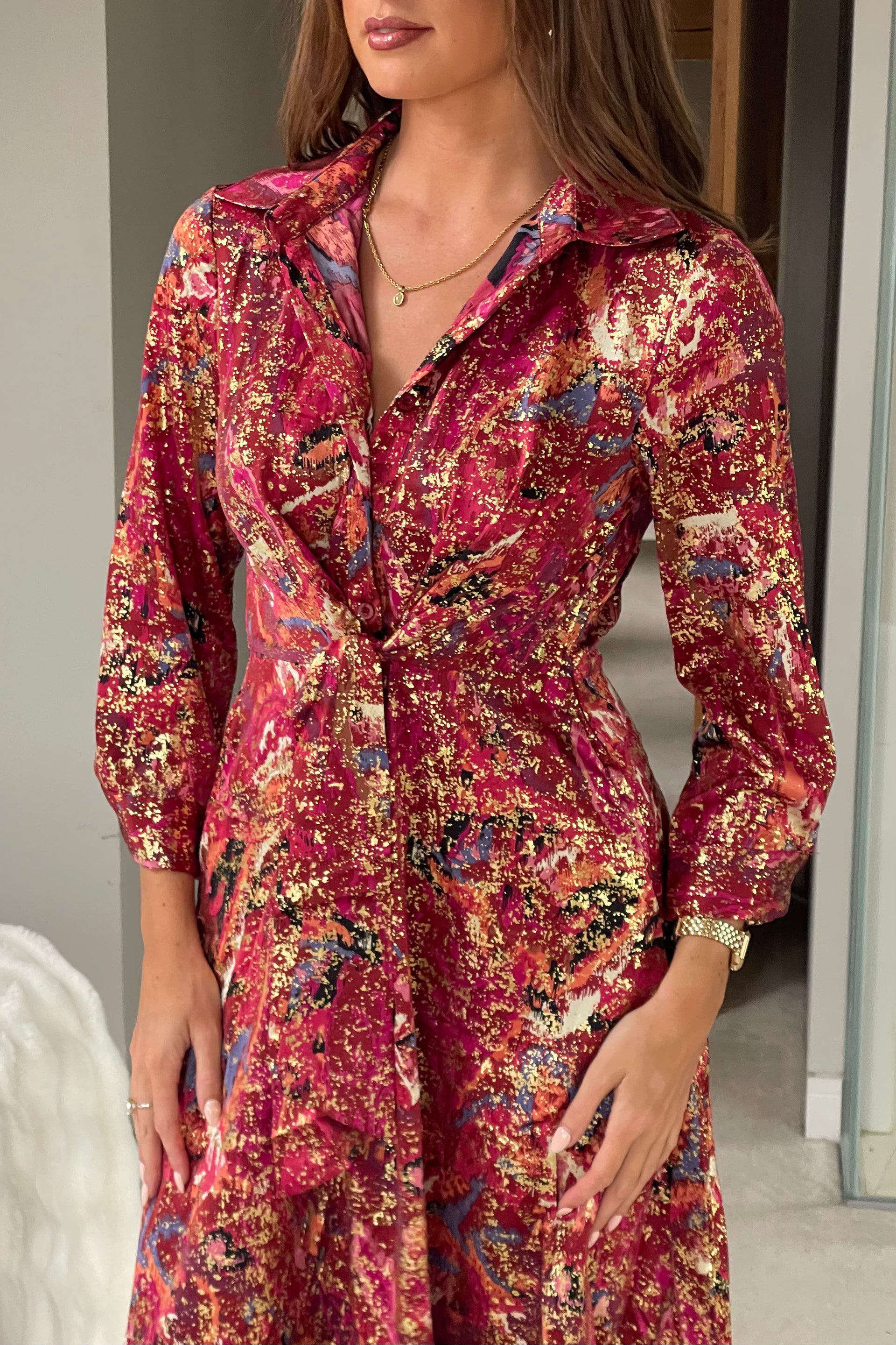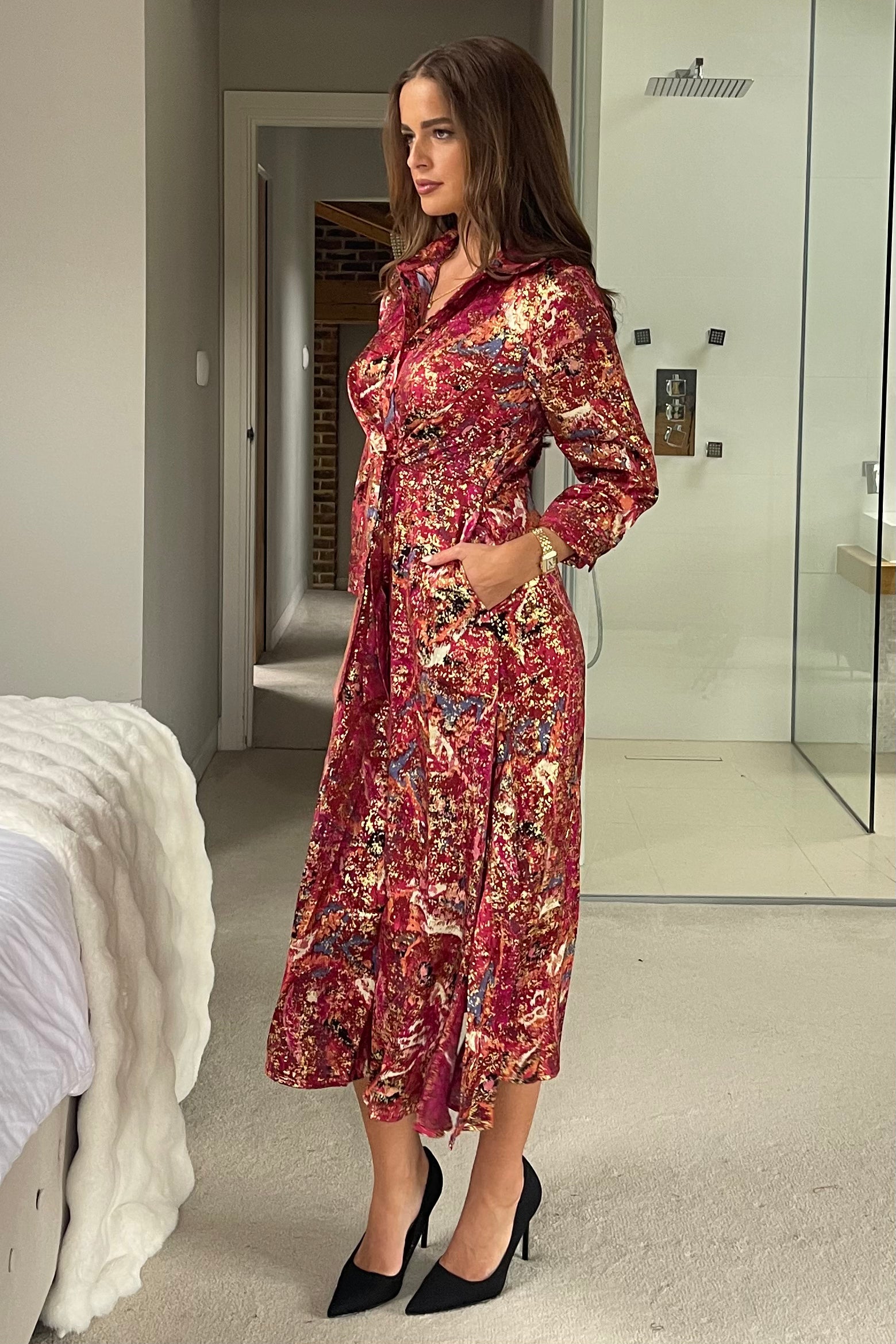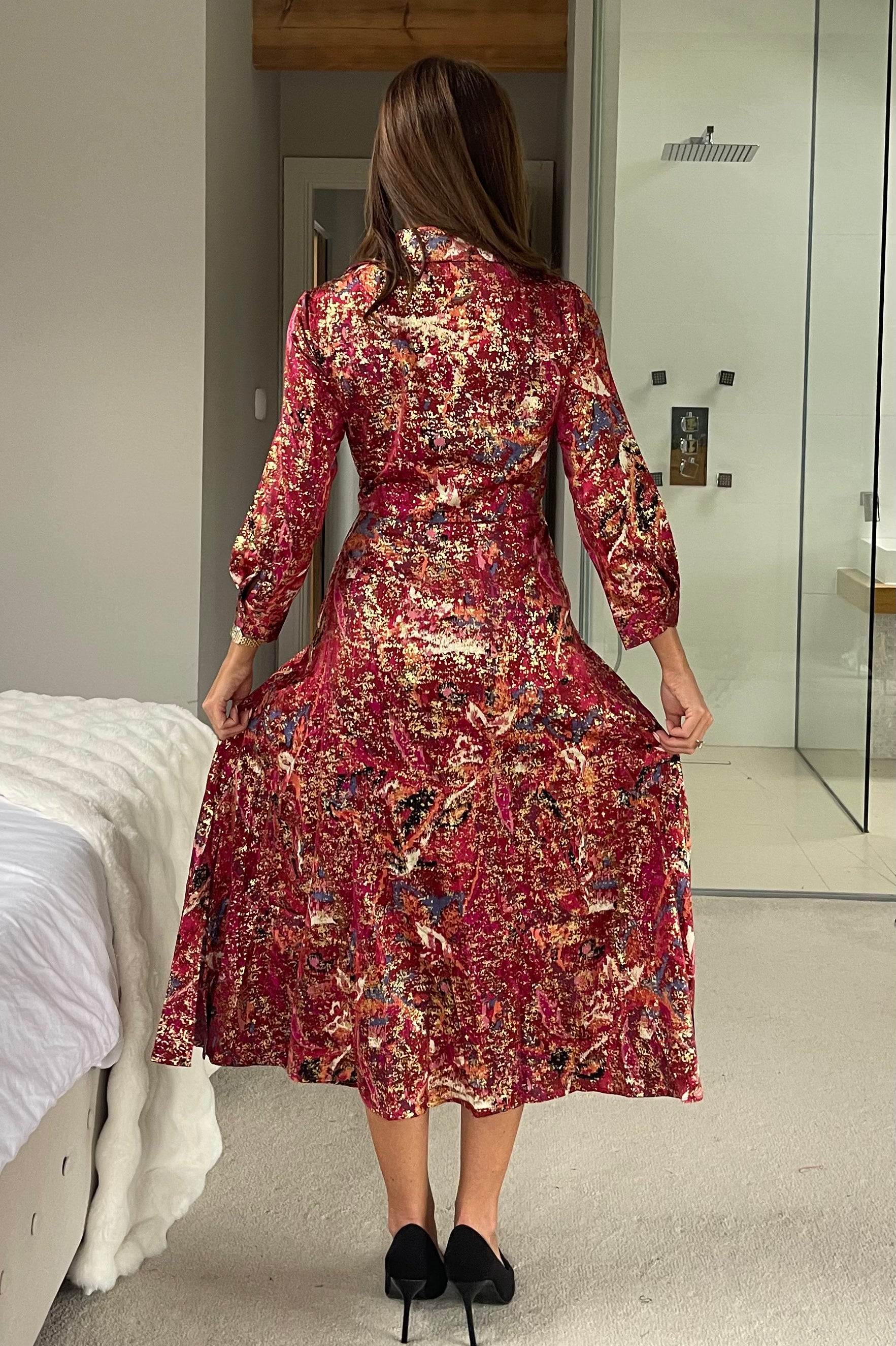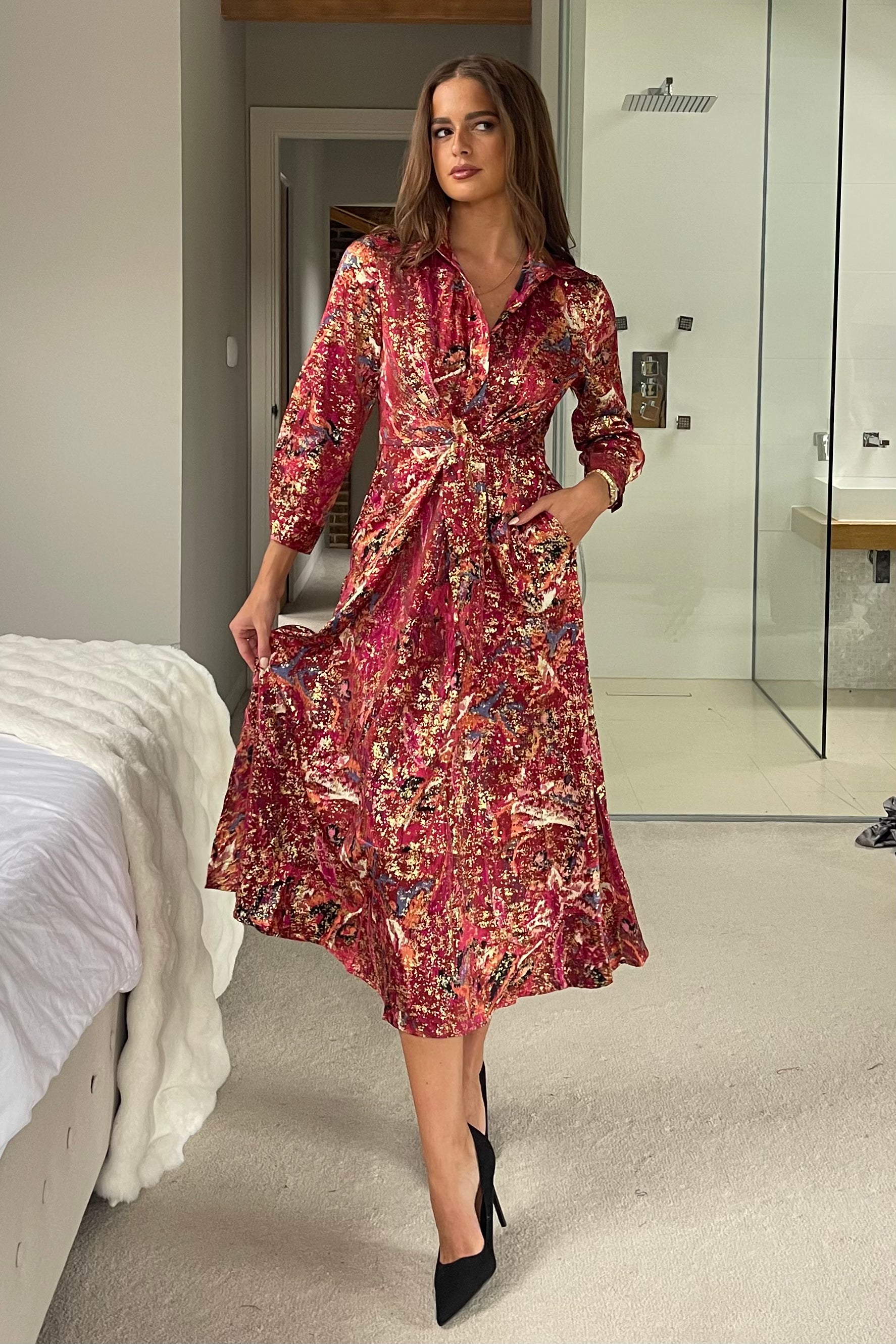 Isabella Foiled Print Tie Front Midi Dress Pink
