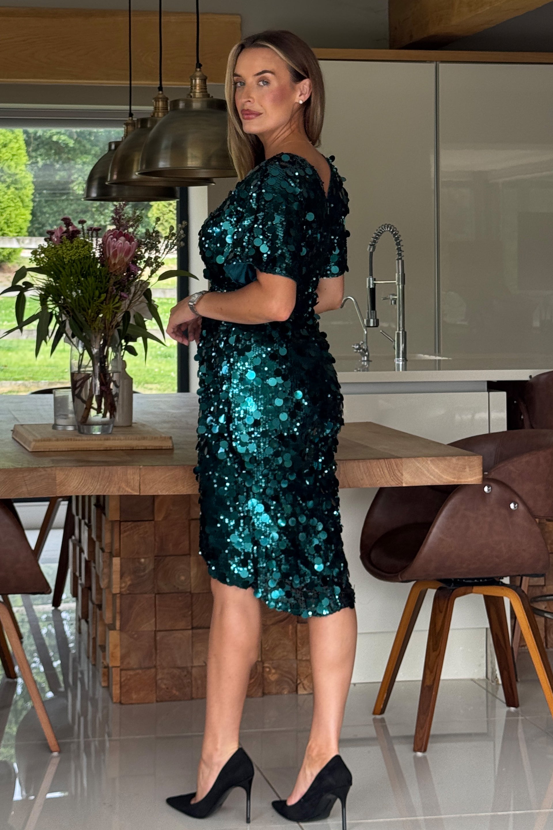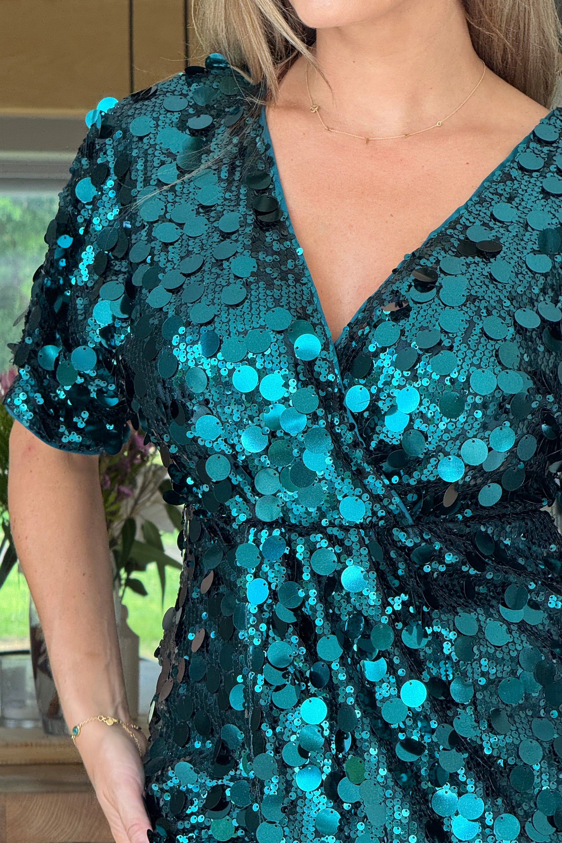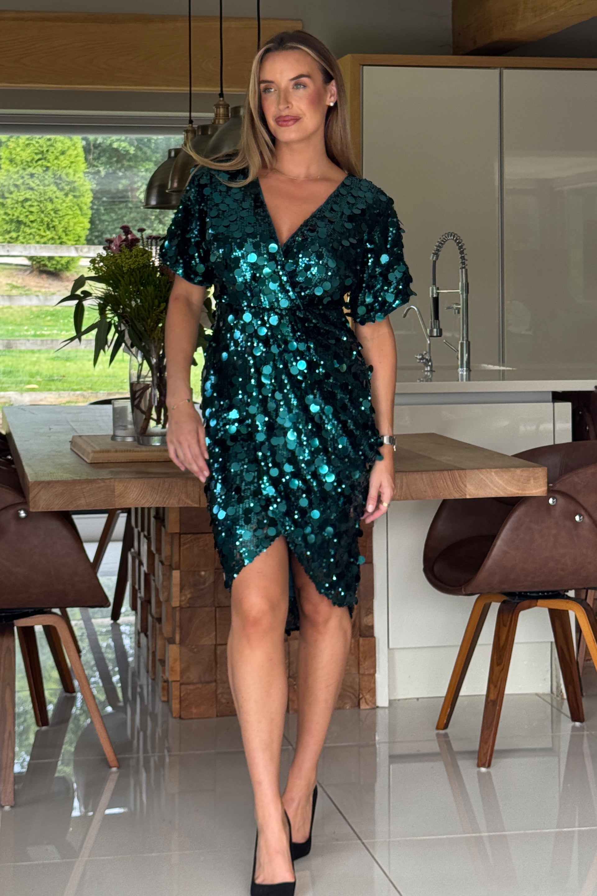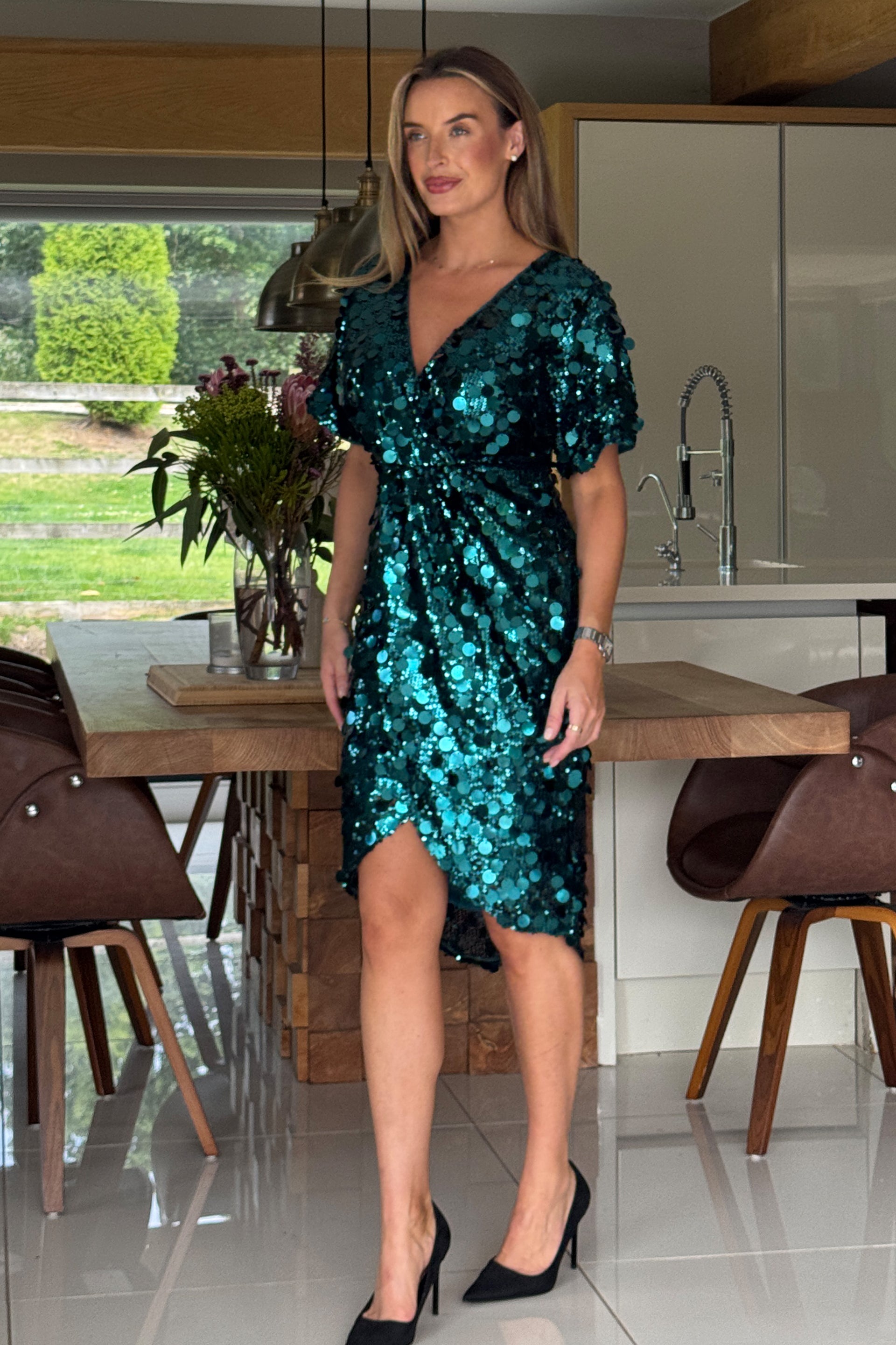 It's the season for sequin and we have the dress. Our Novah Wrap Midi Dress features a wrap over neckline, angel sleeves and a cinched waist. Pair with some matching heels and clutch for this chic style.