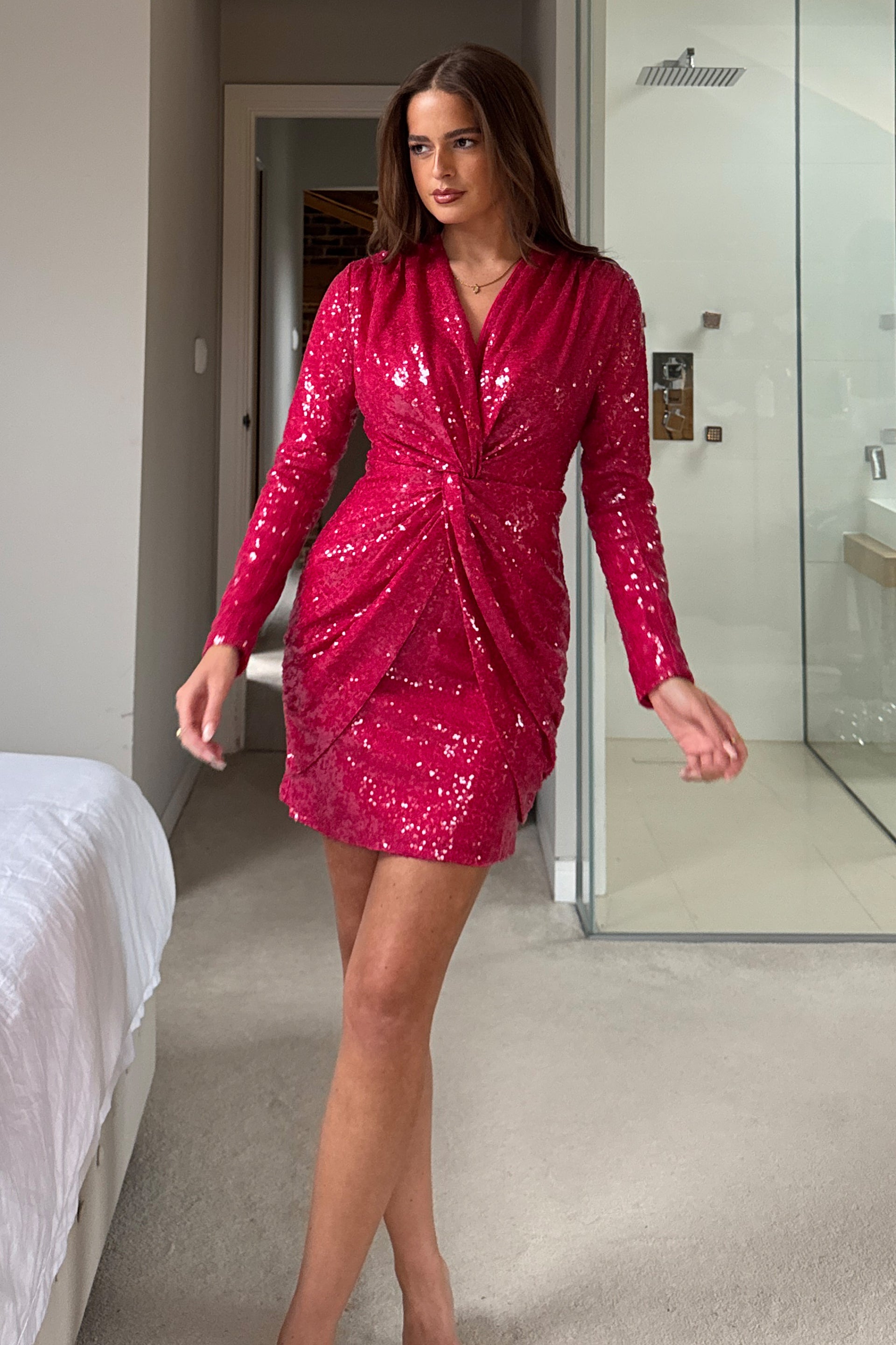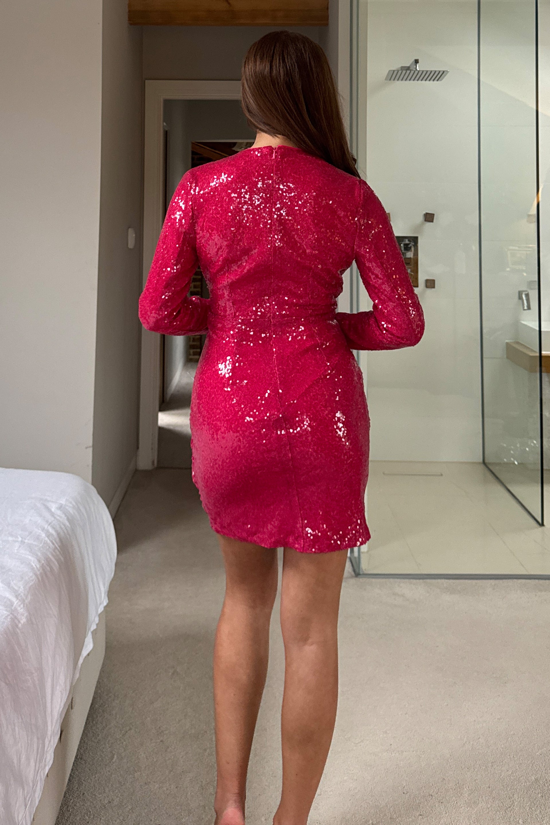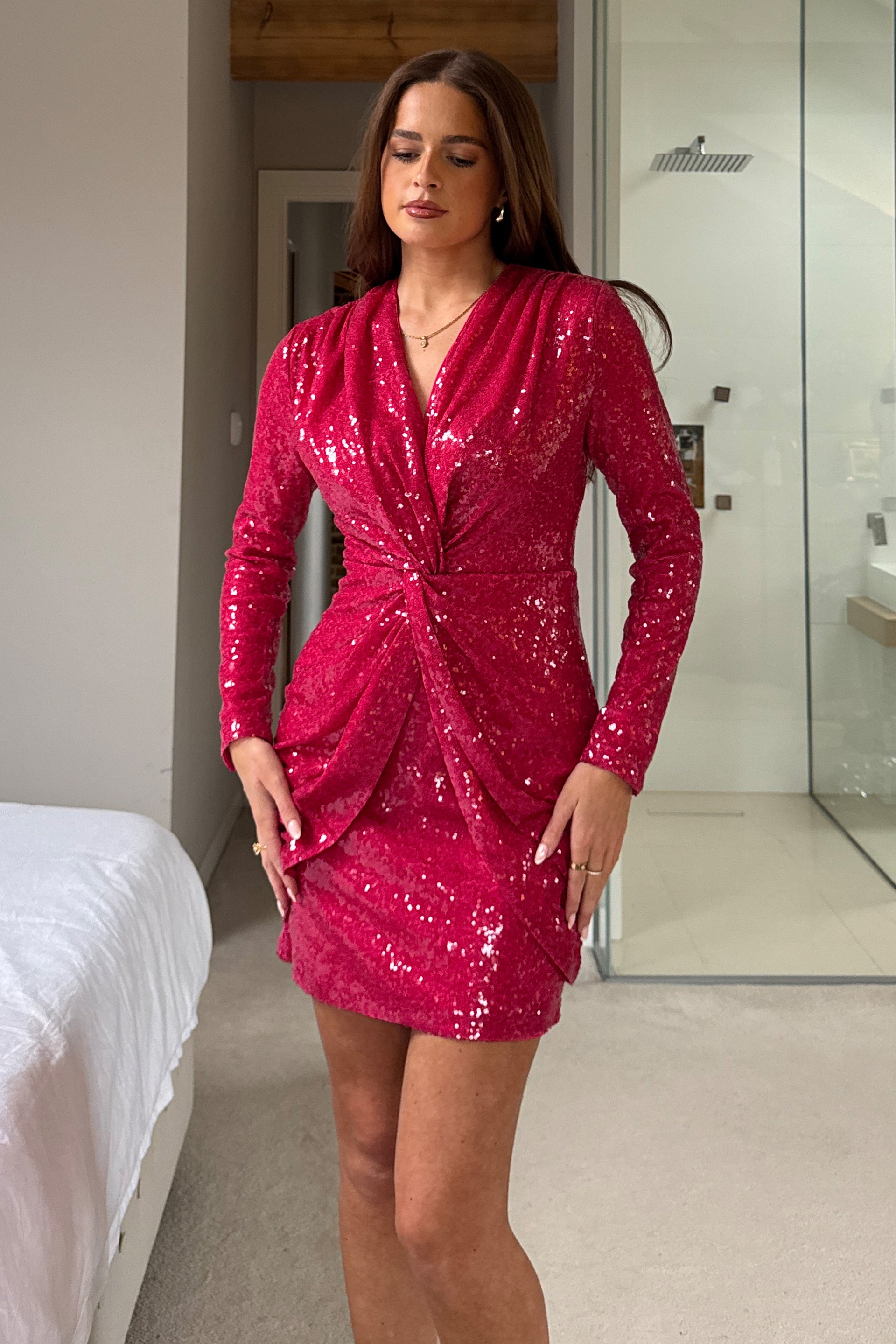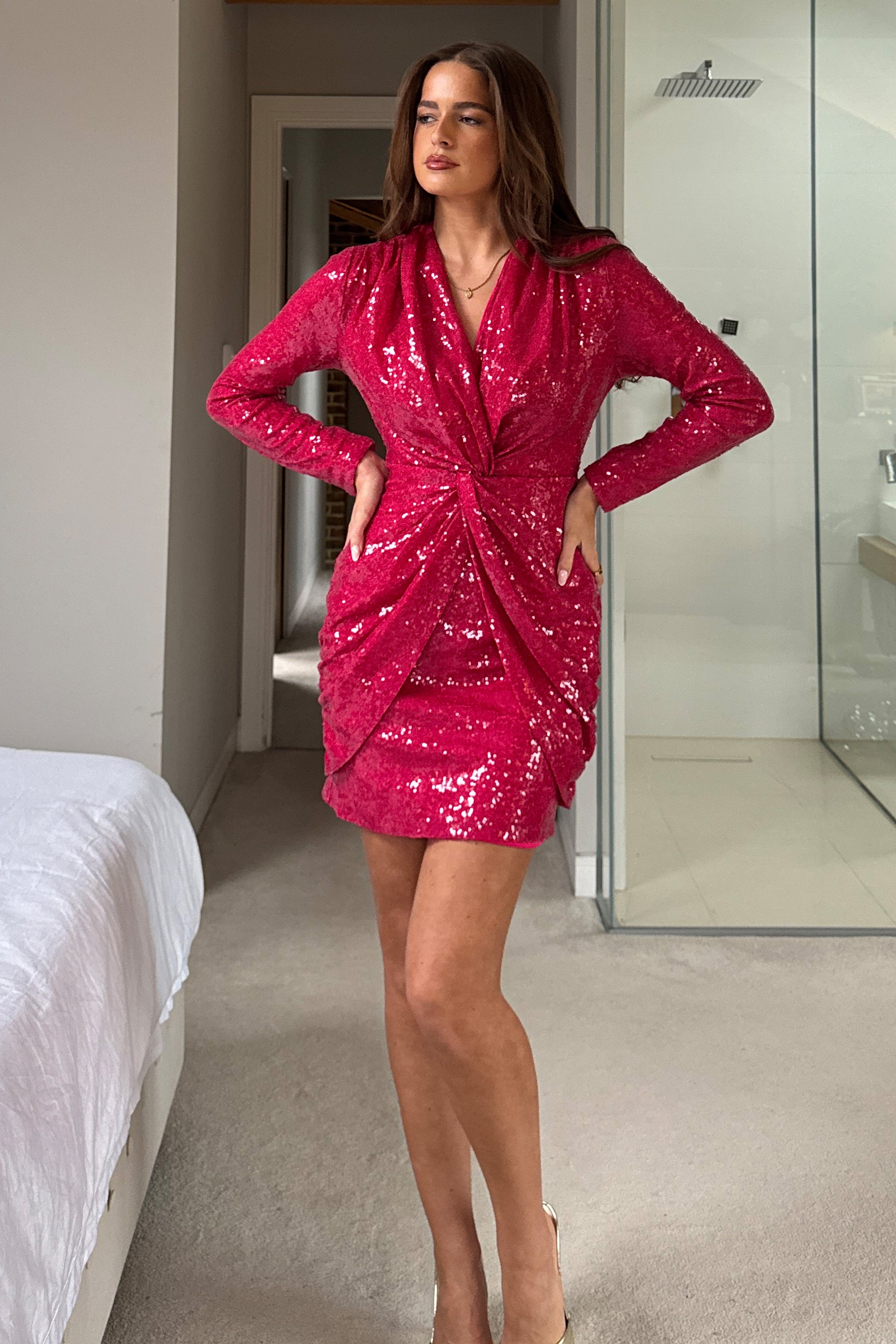 Its the season to wear sequin! Step out in our gorgeous Olivette Pink Sequin Twist Detail Mini Dress and get ready to party. Featuring a plunge neckline, twist detail at the waist and long sleeves. Pair with your favourite heels to complete the look.